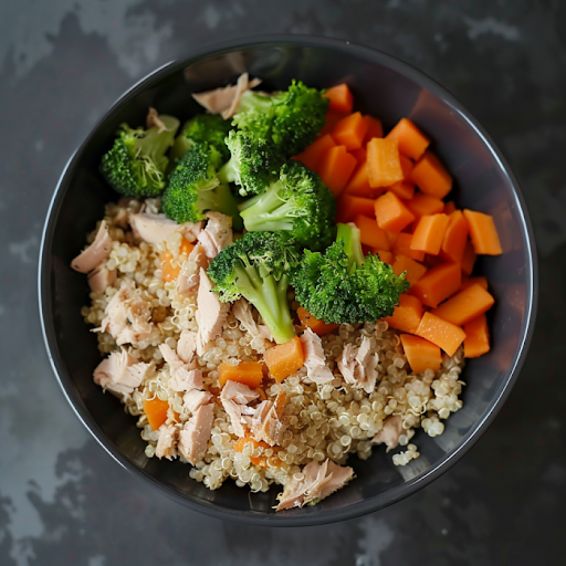 A balanced and low-calorie homemade recipe featuring tuna and vegetables, designed to support weight management in overweight dogs.