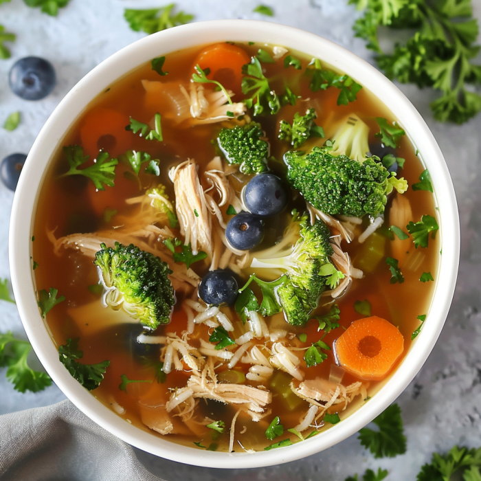 Prepare the Soup: In a large saucepan, combine the shredded chicken, bone broth, steamed broccoli, and cooked brown rice.