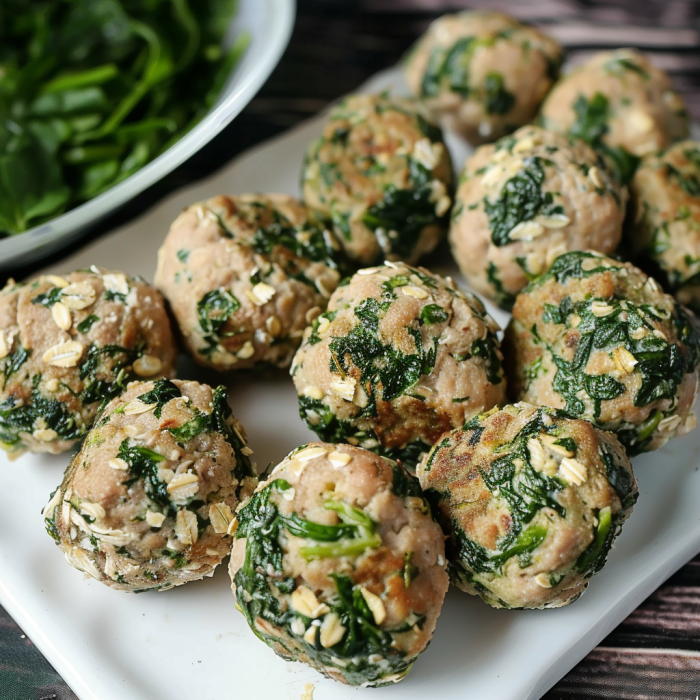 Prepare the Mixture: In a large bowl, combine the ground chicken, spinach, egg, rolled oats (or flaxseed meal/coconut flour), and chopped parsley. Mix until all ingredients are well incorporated.