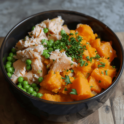 Combine Ingredients: In a large bowl, combine the flaked fish, mashed sweet potatoes, and peas. Mix in the olive oil and calcium carbonate powder. Add a pinch of salt if desired.